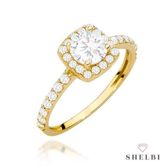 Pierścionek złoty z centralną cyrkonią w kwadracie wysadzany cyrkoniami 585 SHELBI