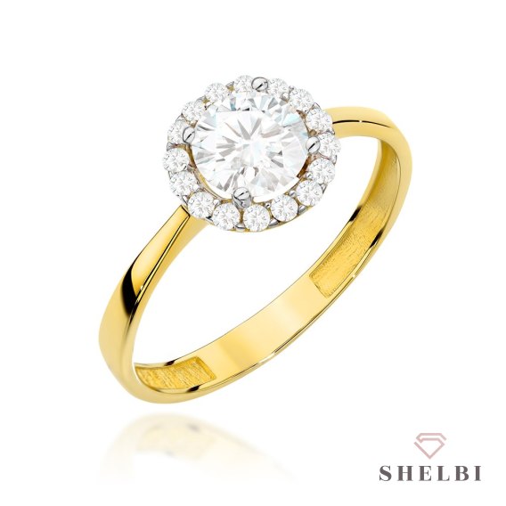 Pierścionek złoty z centralną cyrkonią w oprawie mniejszych i gładką szyną 585 SHELBI